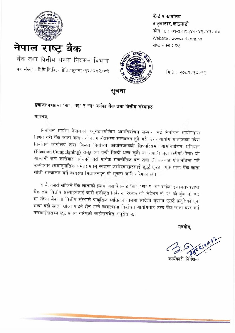 दल र उम्मेदवारको चुनावी खाता खोल्ने व्यवस्था मिलाउन राष्ट्र बैंकको निर्देशन